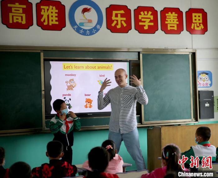 王峰与庆阳市外事办衔接开展外教老师乡村扶贫支教。图为彭阳村天士力小学外教老师上课时情景。侯志雄 摄