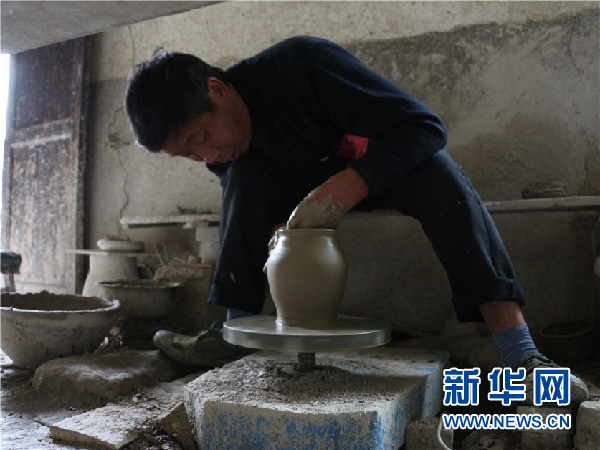新华社贵阳11月2日电(记者郑明鸿)坐在门边的长凳上,潘龙弯下腰,双手握住拉坯机转盘上的一坨陶泥,用左脚踩住控制电动拉坯机转盘的踏板。随着拉坯机的转盘开始转动,潘龙用手指牵引着陶泥,将其塑型成约15厘米高的陶罐泥坯。