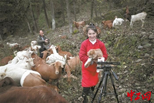 10月28日,陕西省洛南县保安镇东湾村的一个山沟里,29岁的周红珍正在为网友直播她养殖的红山羊。