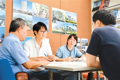 陈信彦(左二)、杨嘉林(左三)在公司与同事讨论建筑设计项目。