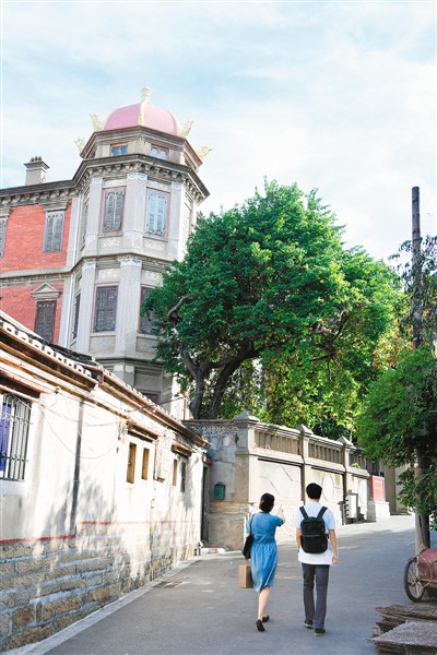 陈信彦和杨嘉林走在厦门鼓浪屿的街巷中。