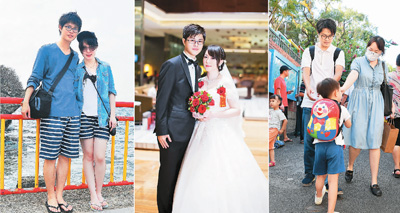 左图为陈信彦、杨嘉林2013年在台湾旅行时的合影;中图为两人2015年在厦门举行婚礼时的合影;右图为2020年9月18日夫妻二人在厦门幼儿园接儿子回家。