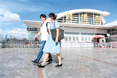 陈信彦和杨嘉林走过厦门鼓浪屿轮渡码头。