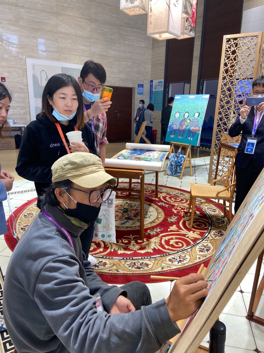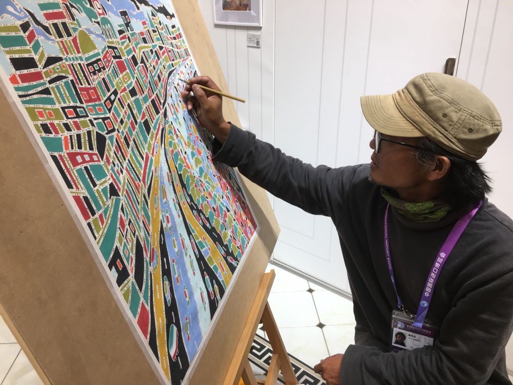 第三届进博会新闻中心特设非遗展示区,陆永忠正在绘制农民画。受访者供图