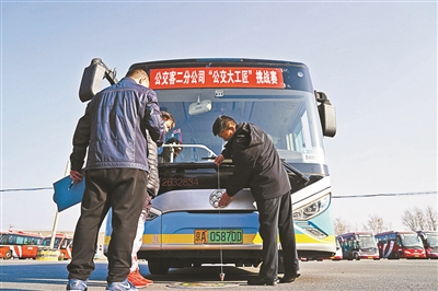 昨天,北京公交集团客二分公司在潞河公交场站,组织开展了2020年“公交大工匠”挑战赛,23名驾驶员参与竞赛。据悉,此次竞赛共设平稳驾驶、站台停车、侧方停车、靶心停车四个挑战项目。图为“靶心定位”测试中,裁判员正在进行测量。(文并摄/记者 黄亮)
