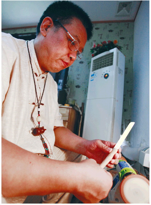 柳森林说,他小时候跟爷爷一起住,从8岁开始跟着爷爷学习制作文刀技艺,到了十几岁就能自己做简单的文刀了。其间,他也吃了不少苦。“爷爷教做文刀时,我就跟着学,关键工序爷爷也会说怎么去弄,但是只要我错了,爷爷二话不说,拿着棍儿就把我手打肿了。”爷爷去世后,留给柳森林几把老式文刀,他就开始照着样子去做。再后来,他开始创新。柳森林告诉记者,之前几代的文刀,都是由整根材质制成的,如一整根红木、一整根竹子或是一整根骨头。现在和圣文刀“以木为柄,以骨为刃”的材质模式,是从他这里形成的,是结合现代人的审美观念作出的合理改进。“有人会问我,文刀可以削水果吗?刀刃能变成尖尖的或者弯弯的吗?我说我不做这个。多少代以来,和圣文刀都是这个制式,改得多了,文刀就变味儿了。我只能更多地从文刀的选材和文化内涵上去改进。”