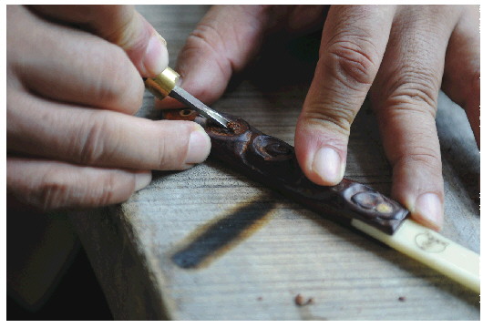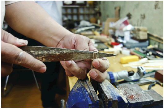 柳森林喜欢用紫檀或黄花梨做刀柄,其中小叶紫檀居多,有时也会用到竹子和动物的角。“竹子这种材料很难选,因为用竹子做刀柄必须直径合适,竹子是不能打磨的,像湘妃竹、梅鹿竹等,表层都有图案,一打磨图案就被破坏了。所以很长的一根竹子,有时候只有一两段是可以用的,其余部分就全都废掉了。动物的角也是一样,角的表面通常有螺纹,这些天然的纹路打磨之后就没有了。”