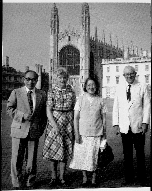 1984年,侯仁之与妻子张玮瑛在剑桥大学与达比教授夫妇合影。