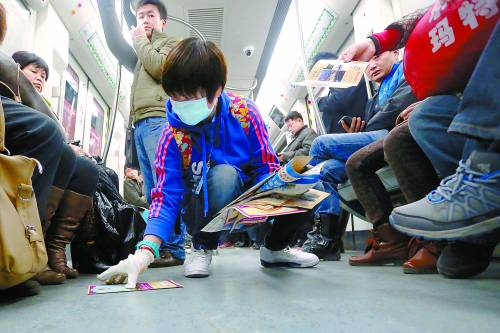 11月16日下午,64名志愿者来到北京地铁10号线巴沟站清理小广告,200公斤的小广告被撕成“废纸”,交给地铁工作人员处理。这些志愿者是自发组织在一起的北京青年,清理小广告活动名叫“北京清粘”,他们经常在周末行动。