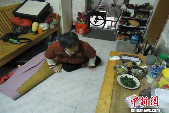 17日下午,56岁小儿麻痹症患者张红英爬在地板上找东西。 苏路程 摄