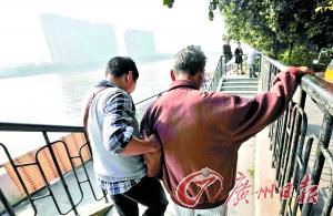 昨日,小谭(左)扶受伤的流浪者老陈下阶梯。
