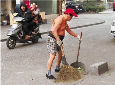 说起老杜的身体,他的邻居也是没有一个不羡慕的。每天早晨,老杜扫地的标准搭配是头戴“小红帽”,光着膀子,穿一条短裤,现在这么冷的天,也是这样的打扮。只是在气温零下的时候,会在老伴的叮嘱下穿上一件背心。