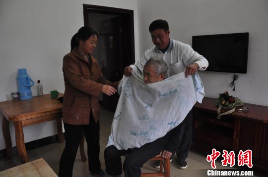 黄常明夫妇正在护理郭名奎老人 王冬媛 摄