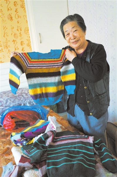 刘奶奶乐呵呵地展示为孩子们织的毛衣。