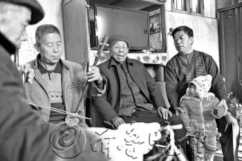 “打开店门亮堂堂,借担担花我下乡。一行好走来得快,行走来到这个岔路上。”18日,在胶州市胶东办事处东小屯村一农家小院里,101岁的杨学顺老人陶醉地唱着秧歌戏《锯大缸》,旁边71岁的大儿子和69岁的二儿子拉着二胡吹着唢呐给他伴奏,一岁半的玄外孙女听得入了迷。