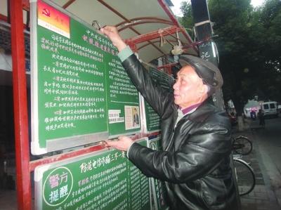 为了黑板报的内容都是新鲜资讯,朱利祥每天清晨5点就起床去拿报纸,花上1个小时先把当天的重要新闻挑选出来,每天他要看五份报纸,并把当天重要的国家大事和民生要闻挑选出来放在前面,一些美文、保健类稿件则放在后面。挑选完稿子,他便开始了1个多小时的出黑板报工作。“这是件公益事业,让别人开心,我自己也开心。”朱利祥老人说,长期坚持出报他有了很多固定读者,哪天要是出迟了就能看到老伙伴们在那等他。“我天天都来看,年纪大了,闷在家里有时心情不好,出来看看板报就缓解,我最喜欢养生这一个版。老朱黑板报完全是公益的,我们很感动,需要这种正能量。”家住附近的黑板报粉丝王大爷如是说。8年多的寒来暑往,朱师傅不知疲倦、默默无闻、坚守着每一天。他书写的黑板报每年除了和纸质媒体一样春节停刊几天外,几乎从不间断。因此,他被人誉为南京市的“黑板报达人”。(通讯员 朱旭先 记者 张筠)