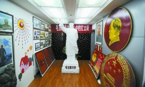 12月26日上午,记者来到甘肃省广播电影电视局家属院,一栋二层小楼上挂着红色的宣传标语:“纪念毛泽东诞辰120周年”。推门进去,里面的收藏让初次来此的记者不禁啧啧称奇,杨鸣琴以一己之力开办的家庭收藏馆囊括4万枚毛泽东像章、200多幅毛泽东画像、50多尊毛泽东瓷像以及多件杨鸣琴用像章拼接创作的艺术品。杨鸣琴平时就吃住在这个家庭收藏馆中。