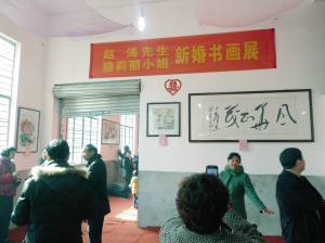 问到怎么会想到在女儿出嫁之际要办个书画展,老骆说,女儿莉丽找了个山东女婿,全家都很满意,在定下日子筹划婚礼时,老骆想,为什么农村举办婚礼除了传统议程的吃吃喝喝之外,就不能搞得有文化一点呢?想起自己长久以来办书画展的心愿,就决定和婚礼合起来搞。