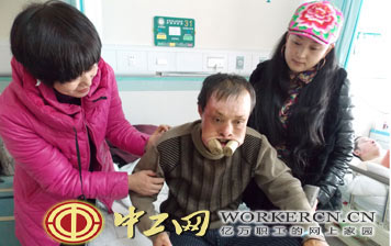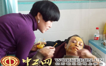 甘肃省人民医院10楼烧伤科的住院病房里,志愿者孙菁、姬宝玉正为杨建军的烧伤创面上精心的涂抹着油脂品。
