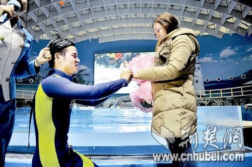 波光盈盈的海洋馆里,数百观众的瞩目之中,24岁的武汉小伙方鹏,展臂站立在海豚上,穿过水池来到女友李芸身边,捧上玫瑰和戒指。这一幕浪漫,昨日发生在武汉极地海洋世界。“两年前就有这个求婚创意,这次专程请假一周秘密苦练。”方鹏骄傲地说起与海豚的默契。