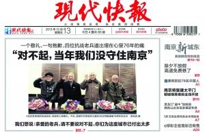 “我等几位对不起南京人民,12月12日撤退的时候部队慌乱,没能很好地组织战斗,使得南京人民在之后的日子里饱受痛苦,在此向南京人民道歉了……”还记得向南京市民敬礼致歉的4位抗战老兵吗?2013年12月13日,现代快报“老兵致歉”引发了巨大社会反响,数十万网友跟帖评论,大家心疼地表示:“你们尽力了!”