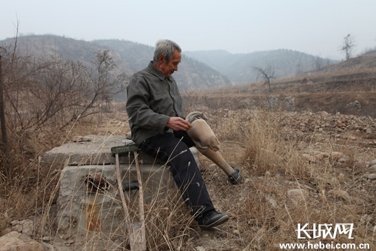 马三小挖坑前需摘下假肢,带上棉套、手套。长城网 张社旗 摄