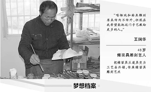 原来傩面具的制作仅限用于当地的傩戏表演,但现在请巫师唱傩戏的人越来越少,加上年轻人多出去打工,傩面具的雕刻日渐凋零。“只靠表演傩戏的来定做几个,赚不了多少钱,自然没几个人愿意学。”王国华说。“唱傩戏和面具雕刻原来有个老规矩,传内不传外,但现在我希望能把这门手艺教给更多的人。”