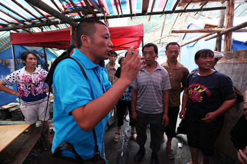 雅安地震后傅强在帐篷里与灾民对话(图片转自中国共产党新闻网)