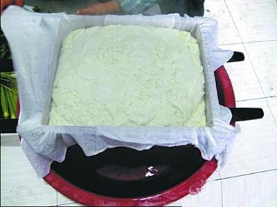 打豆腐传统的做法是腊月廿四的晚上把大豆泡水,第二天捞出上磨,生豆浆磨好后用滤网过滤,再用旺火烧开。随后,将调制好的石膏水点入豆浆里,让其凝固,做成豆腐脑了。最后将豆腐脑盛入密封性很强的模具里,盖好用重物压2小时,出来的豆腐还是热气腾腾的。曹先生的爷爷今年85岁,他亲自踩着1米高的土灶过滤豆浆,还仔细挑出没有磨碎的黄豆重新加工,孙子则在一旁打下手,家乡美食才能勾起儿时的记忆。(万凌)