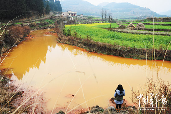 2月10日,中国青年报记者来到小白的家乡贵州省平坝县乐平镇塘约村,在小白所指的乐平河边,记者看到河水完全变成黄色,河两旁种着庄稼和油菜,河道边的一些植物已经枯死,用木棍翻开河底的石头,可以看见石头上有一层黄色的泥,石头下是黑色的泥。