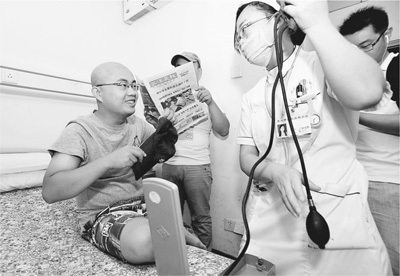 2013年8月30日,即将再次进行取皮手术的刘培(左一)和护士交谈。史 伟摄(新华网发)