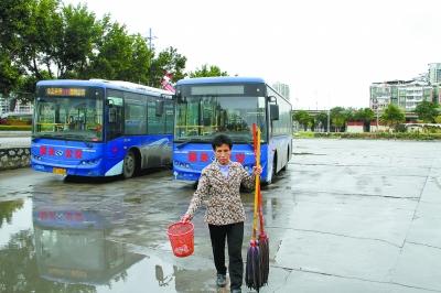 笔者见到李满妹时,她正在为刚刚进站的16路车清扫车厢,只见她首先用扫把清扫车厢内的垃圾,再用干净的拖把将整个车厢地面拖洗一遍,而后再用抹布擦拭座椅,一套清扫程序下来,整个公交车内部便清洁如新。