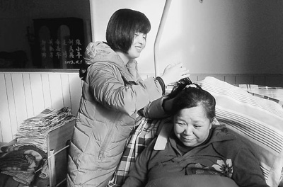 孟佩杰在给养母梳头。本报记者 周亚军摄