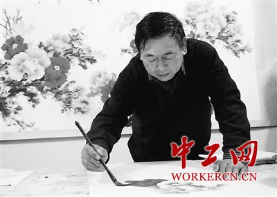 这是一间14平方米的画室,画桌占去了大部分。画室正面墙上镶嵌着铁板,铁板上粘连着毡子,构成了另一个立着的画台。张同庆弯腰低头于画桌前,调色、画花瓣……尚看不出牡丹的雏形,张同庆又站到了立着的画台前,侧身为另一幅牡丹图补枝添叶……