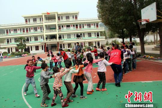 义工们和山区小学孩子们一起做游戏。 吴奇勇 摄