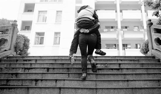 韦慧娟背着儿子,爬上磐安中学的台阶。