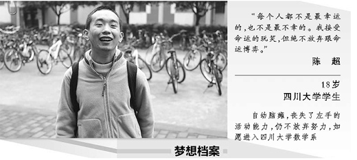 经过申请,陈超终于如愿从环境科学专业转到了数学系,每天忙着看书做题,他说:“大学生活跟我想象中差不多,很丰富,很充实。”这位18岁的男孩儿刚刚考入四川大学,612分的高考成绩也许不算特别显眼,但由于自幼脑瘫,丧失左手活动能力,陈超的努力超过了旁人百倍。