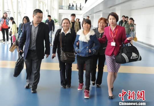 图为,李国容母女一行顺利抵达武汉,在专人护送下出港。