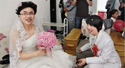 “此时此刻,你们结为恩爱夫妻。从今以后都要心心相印,白头偕老。”在司仪的煽情讲话中,“新郎”马小姐与“新娘”岳先生互换戒指。