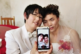 早晨8点,在滑县新区的家里,来自浙江省金华市31岁的岳先生穿起了婚纱,描眉化妆,翘首以盼来自滑县的28岁“新郎”马小姐的迎亲车队。