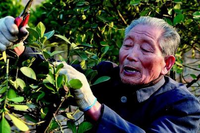 齐仲平老人正在细心修剪苗木。 徐小刚摄