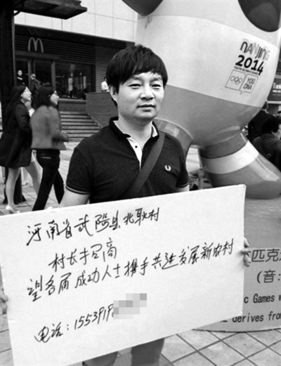 “5月7日至11日,北京王府井大街等闹市区,河南武陟县小董乡北耿村主任柴波波挂牌站街招商。他说,村里1300多口人,没什么企业,村民多以种地为生。后来他琢磨建一个养羊合作社,但因为资金问题,从建厂到现在,一直运转不起来,这才想到招商。这是啥招数?”5月13日,网友“@刘主饪”的微博留言引发网友热议。