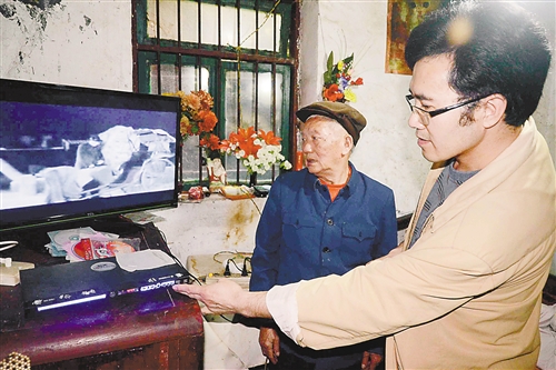 志愿者曹正东(右)为孤寡老人调电视。记者 颜安 摄