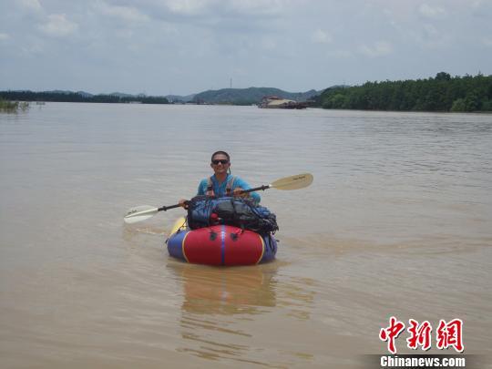 珠海独木舟探险爱好者闪米特花了64天时间完成了2400多公里的珠江漂流探险,图为其在珠海斗门六乡登陆场景冒韪摄