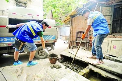 五福路一老社区里,“80后”的王轩在疏捞堵塞的粪池。记者 苗剑摄