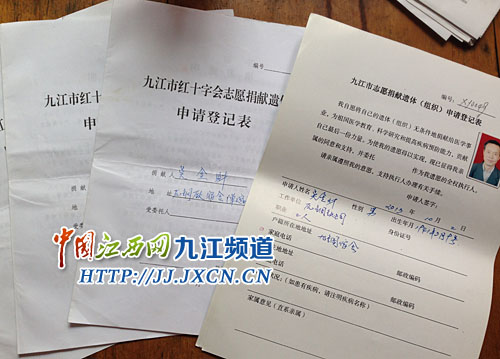 10时许,记者来到了吴金财位于九江浔安小区的家中,吴金财拿出3份《九江市红十字会志愿捐献遗体申请登记表》。“我申请捐献遗体好几年了,拿登记表都拿了好几份。”吴金财说,1996年,老伴去世后,他便去深圳打工,从那时起就萌发了捐献遗体的愿望。