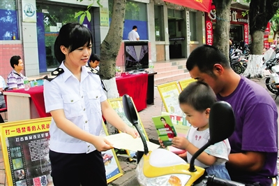 海口市龙华区中山街道办事处、药监局的工作人员走上街头散发宣传资料,宣传毒品危害。(资料图片) 本报记者 武威 摄