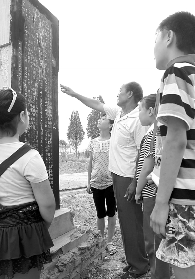 王志杰为周边村庄的小学生讲述碑文中记载的英雄人物事迹。郝红军摄