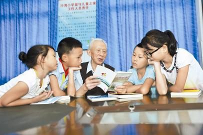 周崇义老人在沙湾区小学“留守儿童之家”给孩子们介绍课外读物。
