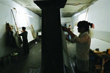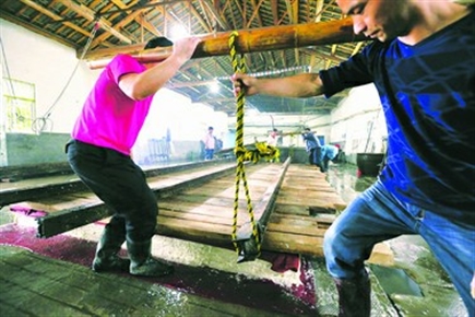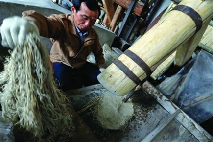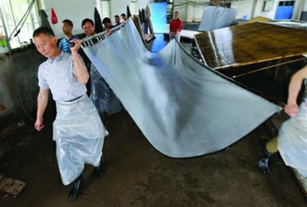 一张宣纸可以保存八百至一千多年,由于目前产量偏少,于是出现“存黄金不如存宣纸”的说法,导致宣纸价格一路暴涨。图为宣纸进入扳榨和挤水环节。
